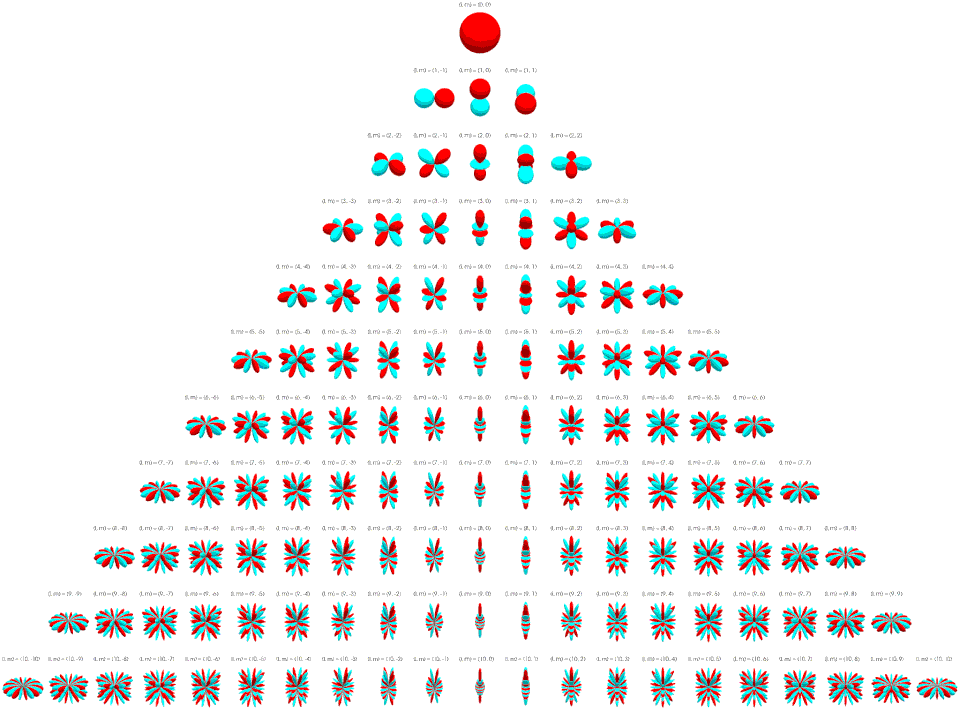 Below the real spherical harmonics are represented on polar plots. The magnitude of the spherical harmonic at particular polar and azimuthal angles is represented by the saturation of the color at that point and the phase is represented by the hue at that point.