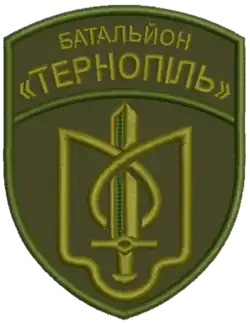 It was established on 24 April 2014, in order to ensure the rights and freedoms of the residents of Ternopil Oblast, protect the region from criminal organizations and protect public order. It was composed mainly of Euromaidan activists, volunteers and veterans.[1] On 28 June 2014, senior chaplain Vyacheslav Kizilov consecrated the crucifix of the battalion. In the first days of July 2014, the battalion was deployed to ATO zone. On 2 August 2014, more soldiers of the battalion went to the ATO zone. On 7 September 2014, 50 soldiers of the battalion returned to Ternopil. On 5 September 2014, 50 personnel of the Battalion were provided with two sets of uniforms, personal protective equipment, and 5th class body armour, ammunition, diesel generators amongst other equipment. They departed after being blessed by priests. On 12 September 2014, the Battalion did a press conference stating that "Ternopil" battalion did not partake in combat, but was very close to the front. Mostly it performed operations at checkpoints: first in the Kharkiv Oblast, and then Pervomaisk and Popasna.[2] On 18 November 2014, the deployed soldiers returned home. During 2015–2016, the battalion continued performing non-combat operations in the ATO zone. In May 2016 it was reformed into a police company.