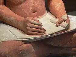 The scribe has a soft and slightly overweight body, suggesting he is well off and does not need to do any sort of physical labor. He sits in a cross-legged position that would have been his normal posture at work. His facial expression is alert and attentive, gazing out to the viewer as though he is waiting for them to start speaking. He has a ready-made papyrus scroll laid out on his lap but the reed-brush used to write is missing.[1] Both his hands are positioned on his lap. His right hand is pointing towards the paper as if he has already started to write while watching others speak. He stares calmly at the viewer with his black outlined eyes.