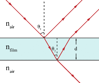 Where is the film thickness, is the refractive index of the film, is the angle of incidence of the wave on the lower boundary, is an integer, and is the wavelength of light.