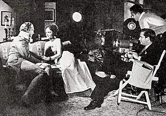 On set of 1936 Anthony Adverse; Mervyn LeRoy (seated right) directing costars March and DeHavilland; behind LeRoy is Tony Gaudio
