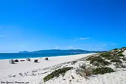The peninsula has a casino, many hotels, some restaurants, a swimming pool and white sand beaches facing the Atlantic Ocean.[2] Here visitors can also find Roman ruins and the Porto Palafítico da carrasqueira.