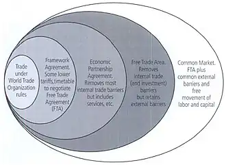 There are a variety of trade agreements; with some being quite complex (European Union), while others are less intensive (North American Free Trade Agreement).[11] The resulting level of economic integration depends on the specific type of trade pacts and policies adopted by the trade bloc: