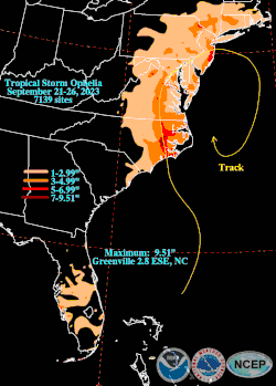 21. ^ "Tropical Storm Ophelia (September 21-26, 2023) rainfall map". Tropical Cyclones in 2023. Weather Prediction Center. 2023-10-17. Retrieved 2023-10-18.