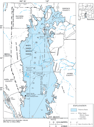 While the Tularosa Basin lies primarily in New Mexican Otero County, it also extends into Doña Ana, Sierra, Lincoln, and Socorro Counties in New Mexico, and El Paso County in southwest Texas.