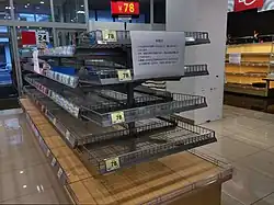 Forecasts across eastern, western, and northern Japan called for strong winds and torrential rain that would likely cause flooding and mudslides.[24] JR Group, Japan Airlines, and All Nippon Airways suspended services.[25] JMA weather forecaster, Yasushi Kajiwara, said, "It is a level 5 situation; some sort of disaster may have already taken place. People are strongly advised to act to protect their lives right away."[5] Evacuation orders have been issued to more than 800,000 households across 11 prefectures.[26] Over 230,000 people took the advice to head to evacuation shelters.[27]