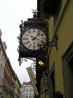 U Fleků is a pub and microbrewery in Prague, Czech Republic. It occupies buildings around a central courtyard at Křemencova 11 in New Town, (Praha 1), not far from the National Theatre. The front facade of the building has an old, highly decorated clock above its door.