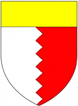 The (ancient) arms of the Willington family: Party per pale indented argent and gules a chief or. All the sons of Joan de Champernon and Ralph de Willington abandoned their paternal arms of Willington (ancient) in favour of a differenced version of their maternal arms of Champernon (see below).[8] These ancient arms are shown in 19th-century stained glass in Atherington Church impaling the Champernowne arms.