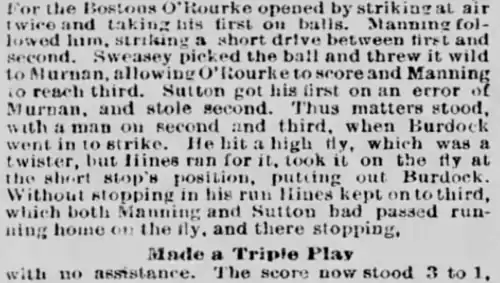 • With runners on second and third, center fielder Hines caught a line drive from Jack Burdock that the runners thought was uncatchable. When he caught it, both runners had already passed third (according to The Boston Globe account of the game, printed on May 9).[9] Hines stepped on third, which by the rules of the day meant both runners were out. To make sure, he threw the ball to Charlie Sweasy at second base. It is still debated whether this was truly an unassisted triple play. Modern rules would have required either the ball to be conveyed to second base to put out the runner who had been on that base and had not tagged up, or that runner to be tagged. According to the Society for American Baseball Research, the runner coming from second, Ezra Sutton, had not yet touched third base, which would mean that even by 19th-century rules the play was not complete until Hines threw to second, and thus the play was not unassisted.[10] Ernest J. Lanigan's Baseball Cyclopedia, 1922, which covers professional baseball back to 1876, states on p. 157 that Neal Ball in 1909 was "the first major leaguer to make an unassisted triple play". The Sporting News Baseball Record Book, which covers records back to 1876, likewise does not list Hines' play in the section on unassisted triple plays.