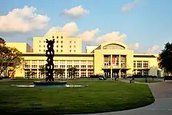 In the mission of finding UH a permanent home, heirs of philanthropists J. J. Settegast and Ben Taub donated 110 acres (0.45 km2) to the university for use as a permanent location in 1936.[32] At this time, there was no road that led to the land tract, but in 1937, the city added Saint Bernard Street, which was later renamed to Cullen Boulevard.[31] It would become a major thoroughfare of the campus. As a project of the National Youth Administration, workers were paid fifty cents an hour to clear the land. In 1938, Hugh Roy Cullen donated $335,000 (equivalent to $5.7 million in 2023) for the first building to be built at the location. The Roy Gustav Cullen Memorial Building was dedicated on June 4, 1939, and opened for classes officially on Wednesday, September 20, 1939.[30] The building was the first air-conditioned college building constructed on a U.S. campus.[28] A year after opening the new campus, the university had over 2,000 students.[28] As World War II approached, enrollment decreased due to the draft and enlistments. The university was one of six colleges selected to train radio technicians in the V-12 Navy College Training Program.[33][34] By the fall of 1943, there were only about 1,100 regular students at UH; thus, the 300 or so servicemen contributed in sustaining the faculty and facilities of the Engineering College. This training at UH continued until March 1945, with a total of 4,178 students.[35]