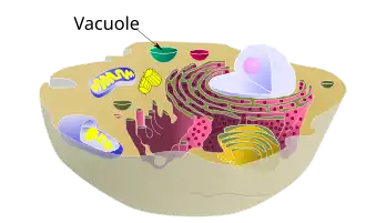 A vacuole (/ˈvækjuːl/) is a membrane-bound organelle which is present in plant and fungal cells and some protist, animal, and bacterial cells.[1][2] Vacuoles are essentially enclosed compartments which are filled with water containing inorganic and organic molecules including enzymes in solution, though in certain cases they may contain solids which have been engulfed. Vacuoles are formed by the fusion of multiple membrane vesicles and are effectively just larger forms of these.[3] The organelle has no basic shape or size; its structure varies according to the requirements of the cell.