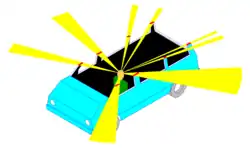 Rearward invisibility is an entirely different matter. The area directly behind vehicles is the source of backup collisions, particularly involving pedestrians, children, and objects directly aft of a vehicle. That area has been called a "killing zone".[12][13] These problems are the object of several technological solutions, including (in rough order of technological complexity, simplest first): rear-view mirror, side-view mirror, Fresnel lens, sonar, parking sensors, and backup camera. A similar problem attaches to positions left and right of a vehicle's rear bumper as the driver attempts to back out of a parking space. Specially designed cross-traffic alert warning systems have been developed to address these.[6][14][15]