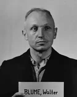In 1945, Blume was captured in Salzburg by the Americans and brought to Landsberg Prison. He was tried at the Einsatzgruppen Trial for his crimes, including crimes against humanity, war crimes and membership of three criminal organizations, the SS, SD and Gestapo.[8] The indictment specified Blume's direct responsibility for the murder of 996 people between June and August 1941.[9]