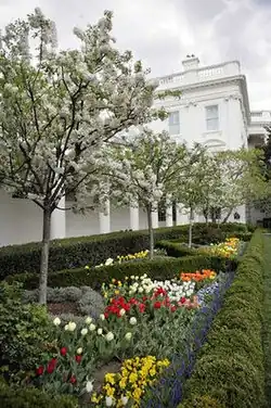 The general layout of the White House grounds today is based on the 1935 design by Frederick Law Olmsted Jr. of the Olmsted Brothers firm, commissioned by President Franklin D. Roosevelt. During the Kennedy administration, the White House Rose Garden was redesigned by Rachel Lambert Mellon. The Rose Garden borders the West Colonnade. Bordering the East Colonnade is the Jacqueline Kennedy Garden, which was begun by Jacqueline Kennedy but completed after her husband's assassination.