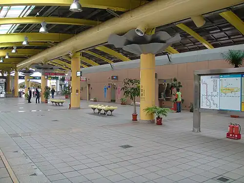 The entrance to the station and platform are situated on the fourth floor of the depot. The station covers an area of 3,000 square meters (32,292 sq ft), while the platform is 70.5 meters (231 ft 4 in) long.[4] Two escalators are located at the two entrances and are 14.45 meters (47 ft 5 in) high and 16.52 meters (54 ft 2 in) high; they are the second longest escalators in the system after those at Zhongxiao Fuxing.[4]