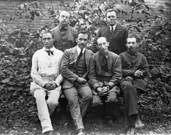 Klen with fellow neoclassicists Viktor Domontovych, Mykola Zerov, Pavlo Fylypovych, Felix Yakubovsky and Maksym Rylsky in Baryshivka, 1920s